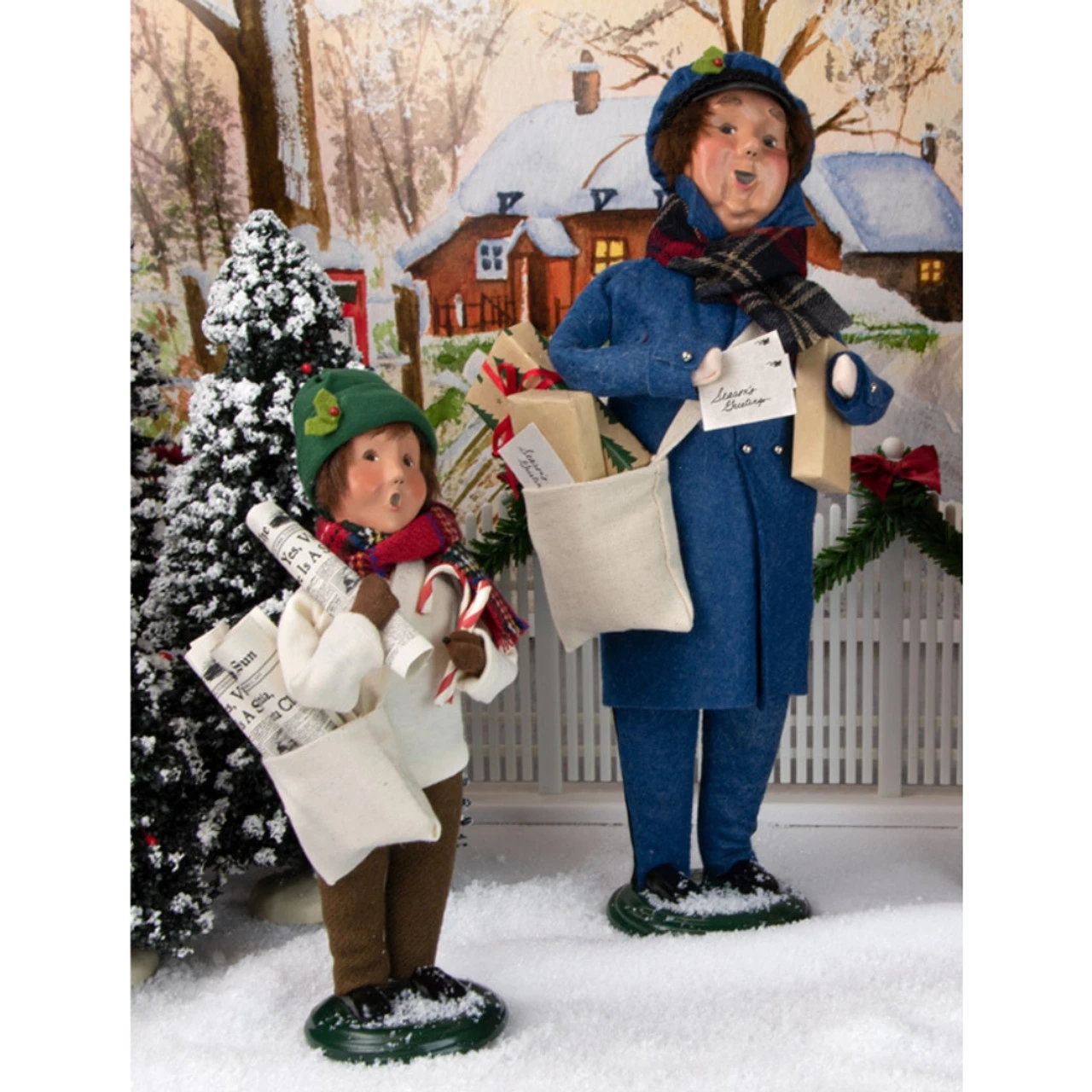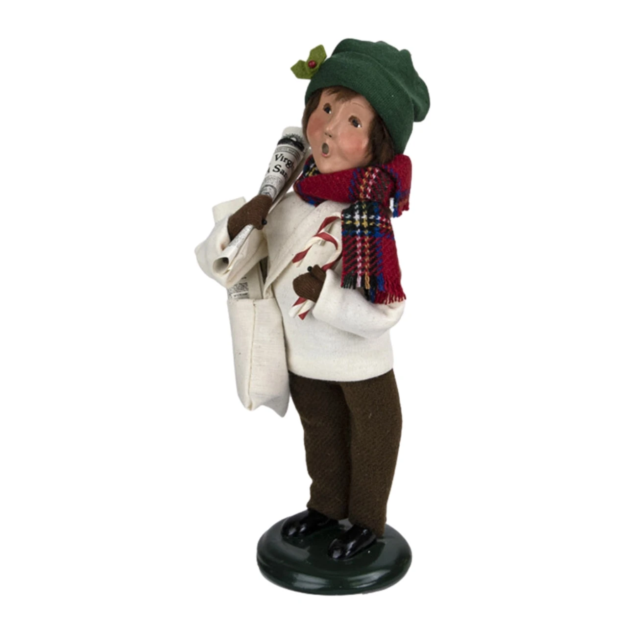 Meet the charming Byers’ Choice Newsboy Caroler, a delightful addition to your festive decor. This 10″ character is draped in an attractively warm green hat and a merry plaid scarf, a testament to the holiday spirit. Don’t miss the detail of his bag brimming with the latest editions of the newspaper, ready to distribute the day’s news to the townsfolk. The careful handcrafted details, from his cheerful expression to his busy satchel, make this Newsboy Caroler a captivating piece, adding a unique spin on your Christmas celebrations. A delightful reflection of an era gone by, he is sure to infuse a dose of vintage charm into your home this holiday season.