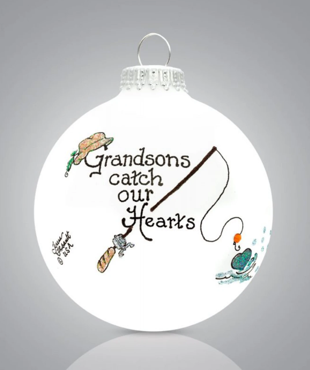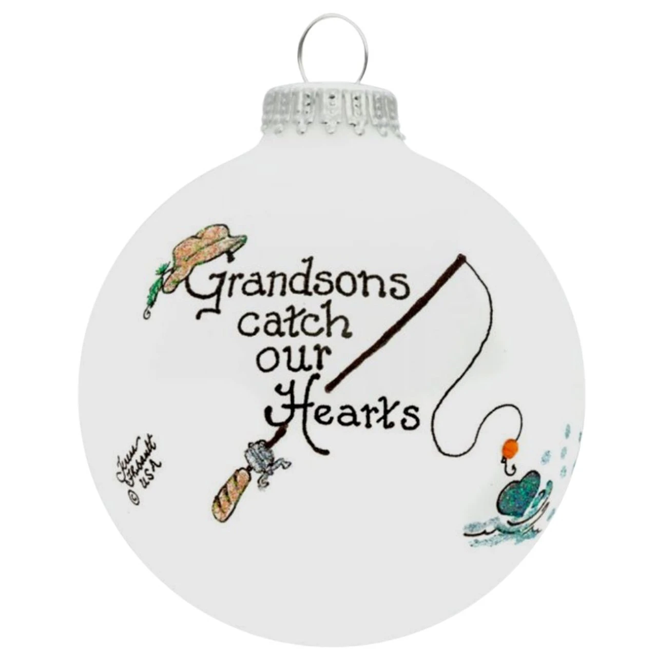 Grandson Fishing Ornament by All American company Heart Gifts by Teresa, this Hand Painted Glass Ornament is especially designed for the love of Grandsons, and proudly source all decorative materials used from American companies – this wonderful glass ornament is inscribed with: