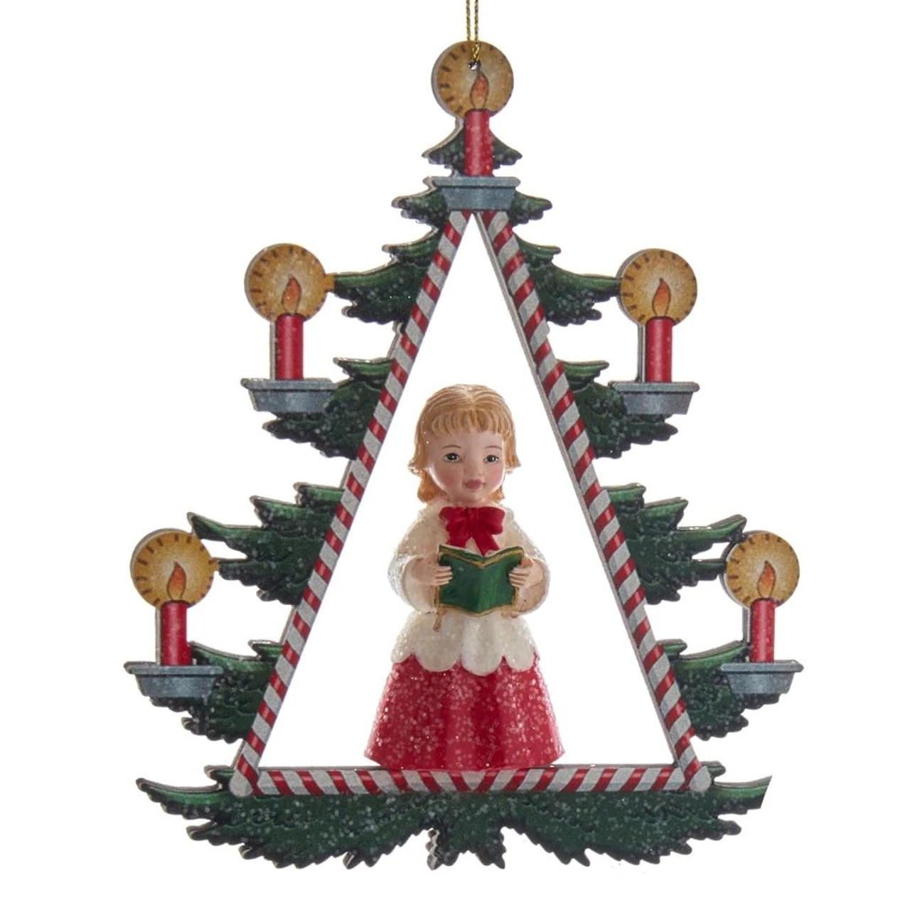 This German-style choir ornament is a wonderful addition to any holiday décor or Christmas tree. This ornament features a choir girl standing in the center of a decorated Christmas tree.