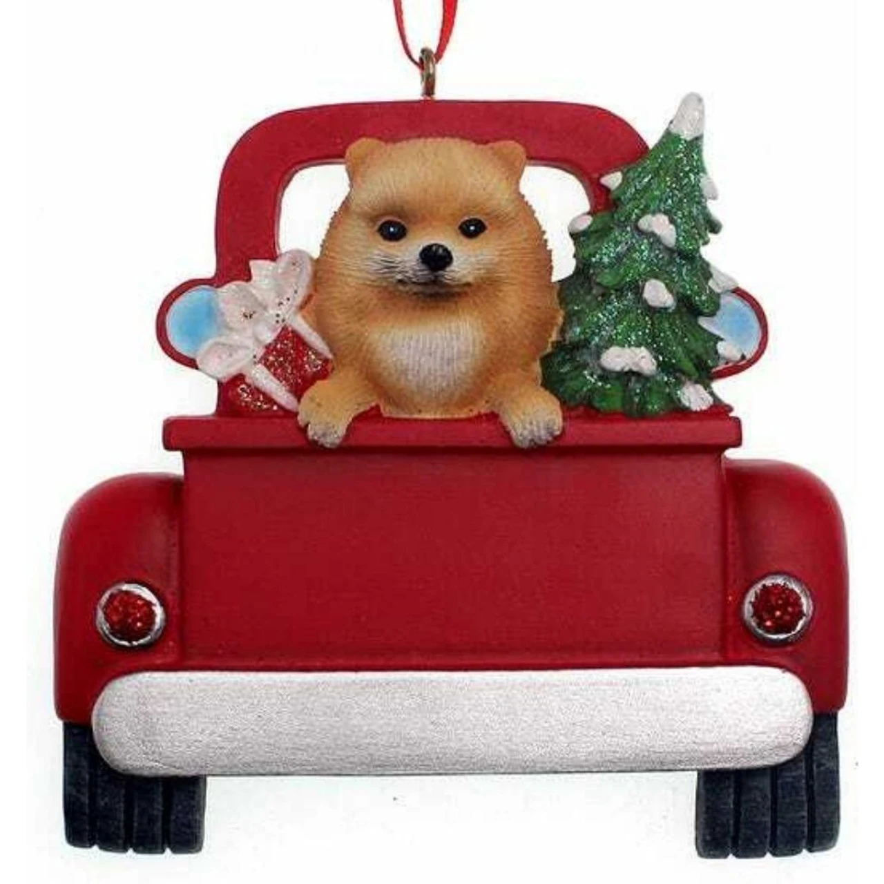 Commemorate a special pup in your life with this Pomeranian in the back of a red truck ornament! Our talented Christmas Loft Elves will personalize this ornament with names/dates free of charge!