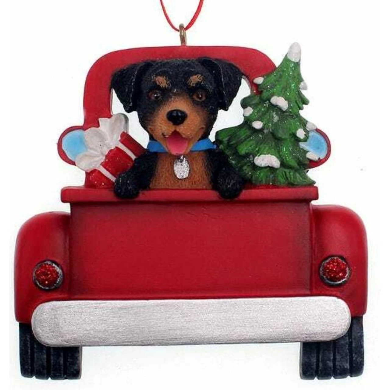 Commemorate a special pup in your life with this Rottweiler in the back of a red truck ornament! Our talented Christmas Loft Elves will personalize this ornament with names/dates free of charge!