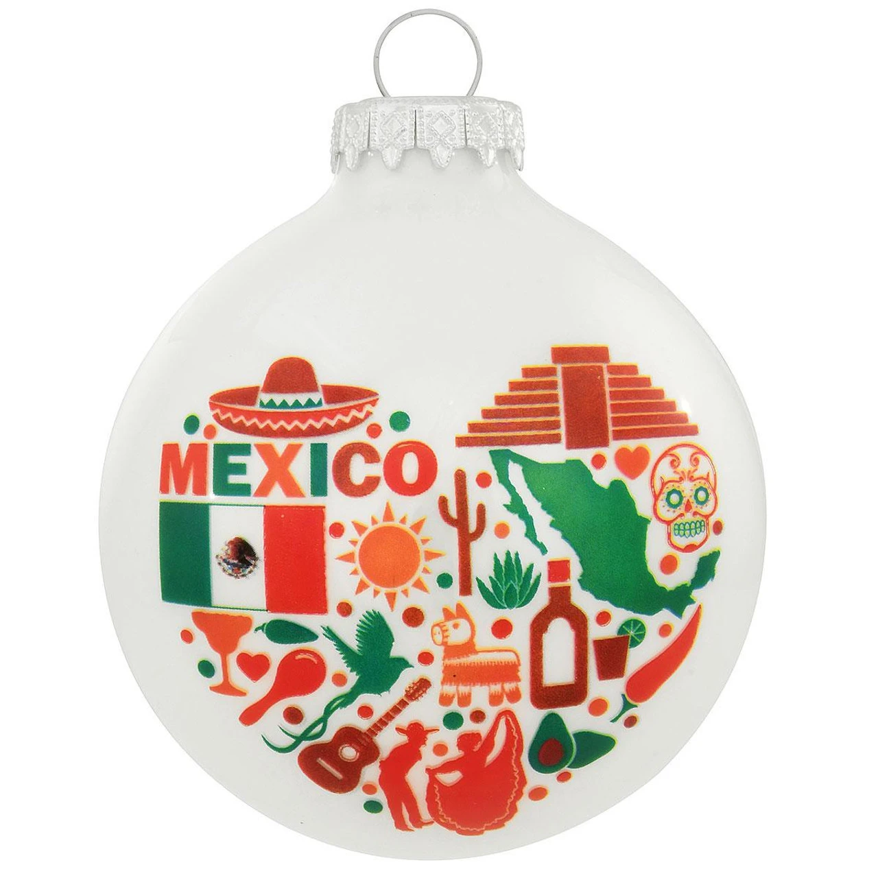 Does Mexico have your heart? Then you’re sure to love our Mexican icons ornament! Exclusively crafted for Bronner’s from glass in Hungary, our 3″ round, white opal ornament celebrates the distinctive customs and traditions of Mexico’s rich heritage in a lovely heart pattern. Symbols include a sombrero, the word “MEXICO”, the Mexican flag, a Margarita, heart and jalapeno pepper. A maraca, guitar, and dancers. A pinata, quetzal bird, sun, cactus, and succulent. An avocado, hot sauce, chili pepper, Day of the Dead skull, Aztec architecture and a silhouette of Mexico.
