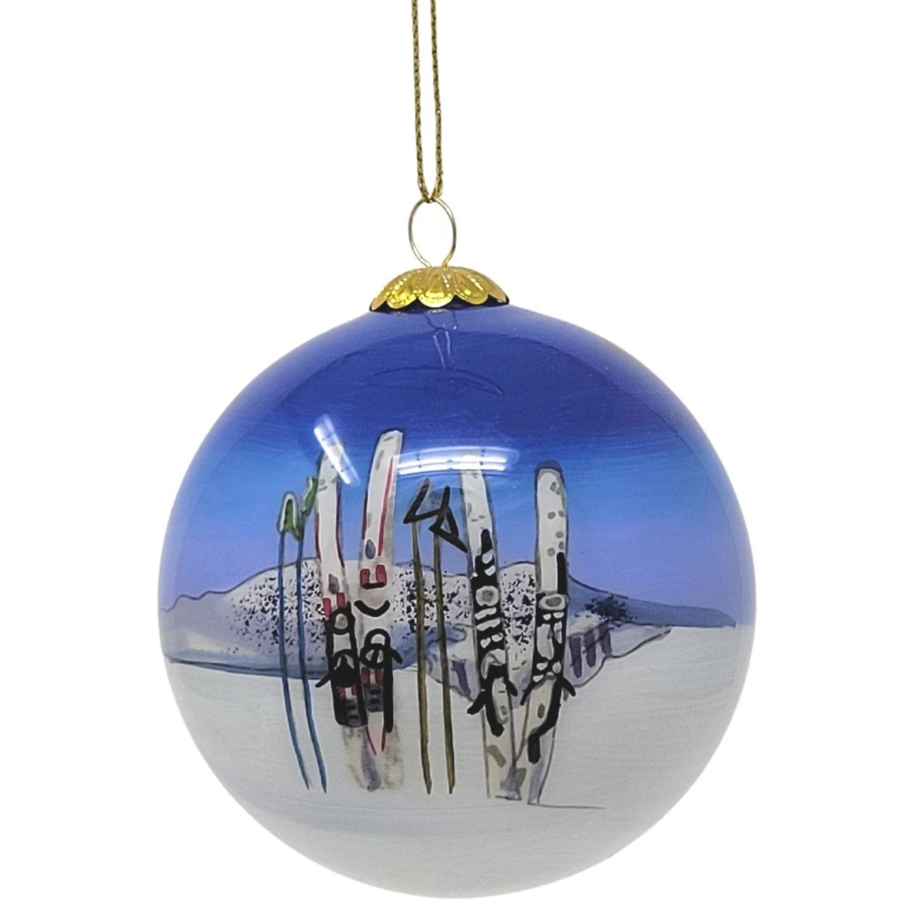 Each winter thousands of visitors from around the world travel to New Hampshire to visit some of the 28 ski resorts across the state . Commemorate a special ski trip with this one of a kind hand painted New Hampshire ornament. Skilled artisans hand blow the glass sphere before passing it along to the painters who use curved brushes to skillfully paint the 306 degree scene on the inside of the ornament. Each ornament comes with a beautiful padded felt gift box. Each ornament is hand painted and one of a kind and designs/colors may vary slightly.
