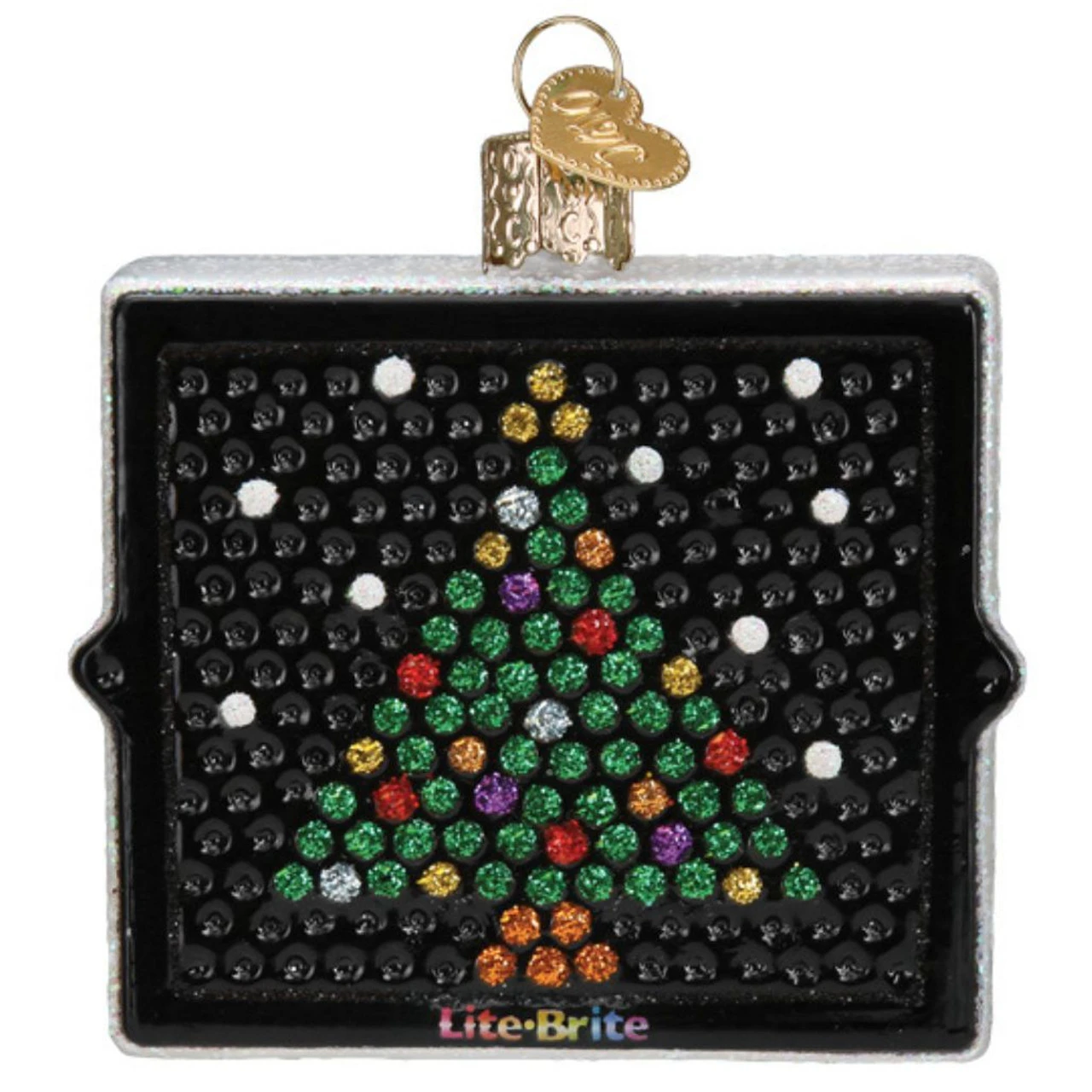 “Lite Brite lets you create art with light using design templates and bright, colorful pegs – then lights it up like a neon sign. Children have happily received a Lite Brite from Santa since 1967. Relive those magical memories of creating Lite Brite art with this hand-crafted glass ornament.”