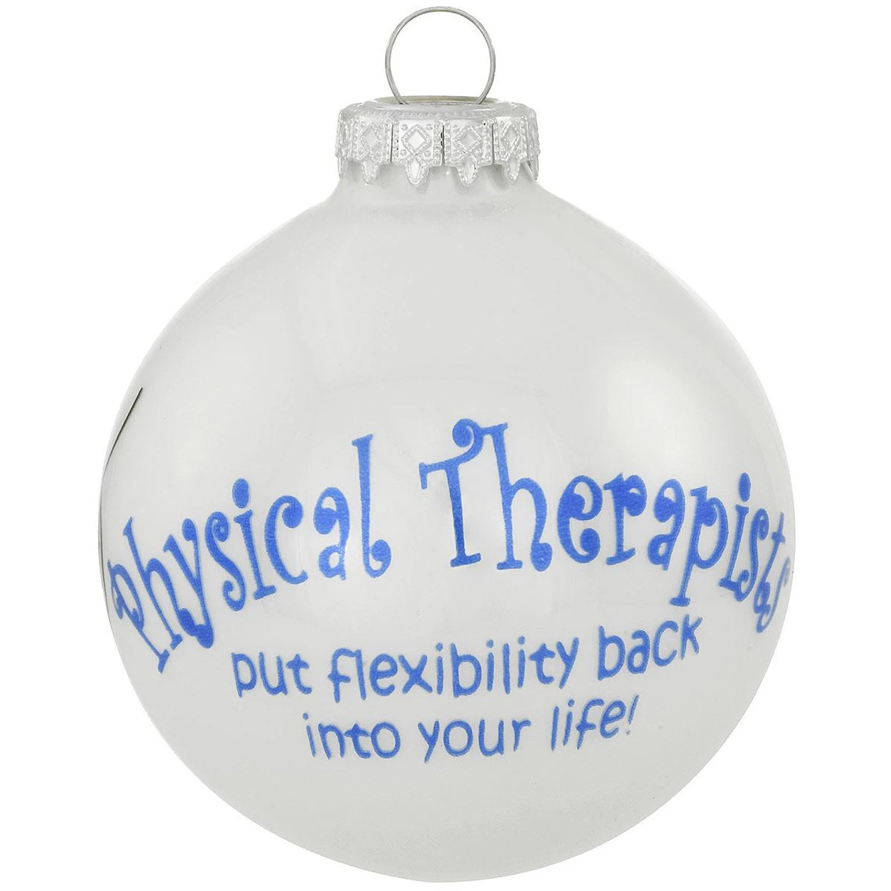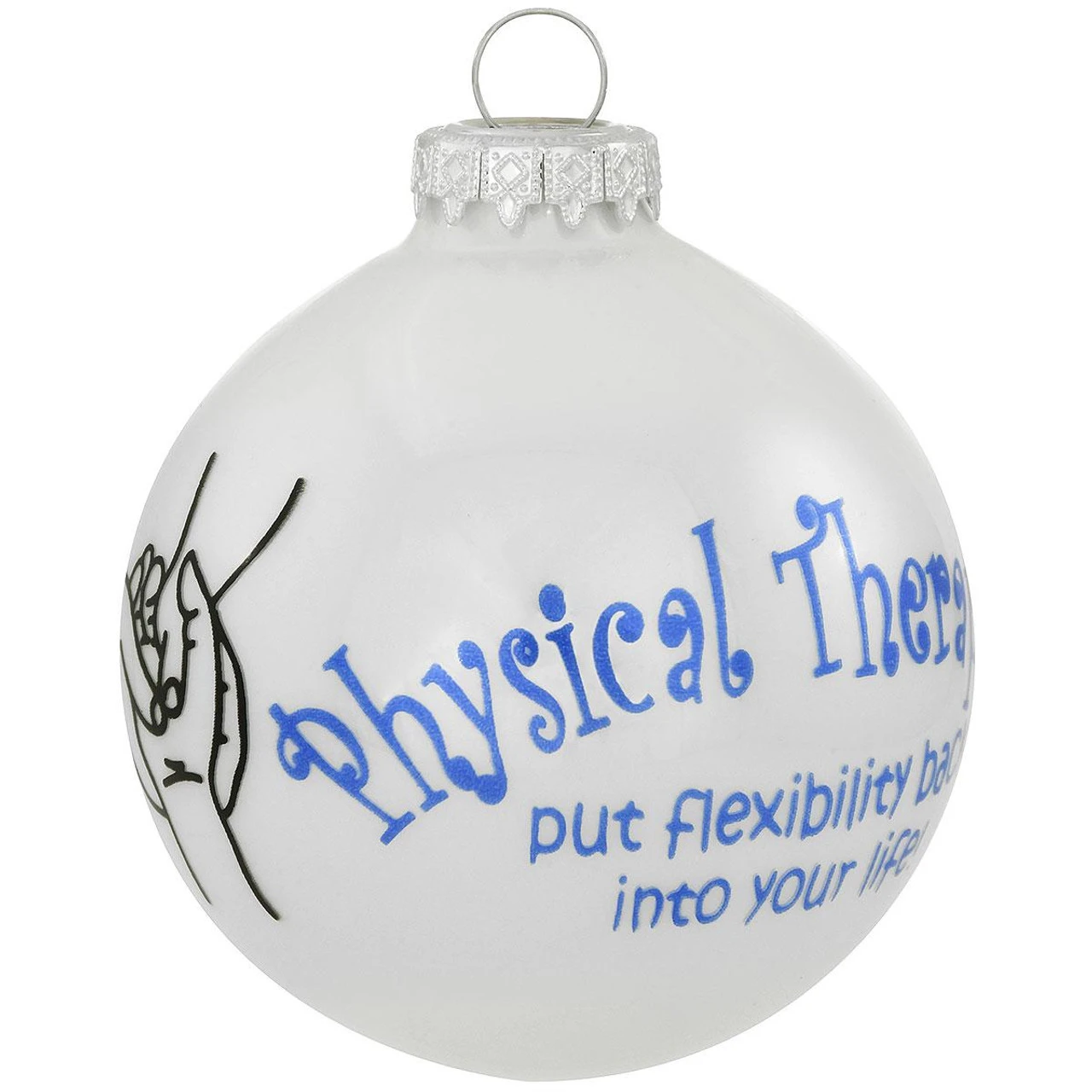 Featuring a physical therapist sentiment in vivid blue, this shimmering white opal ornament depicts a black outline of a physical therapist’s hands gently messaging the hand of a patient. Crafted in Hungary exclusively for Bronner’s, our glass ornament measures 3″ round. Sentiment reads: Physical Therapists put flexibility back into your life!